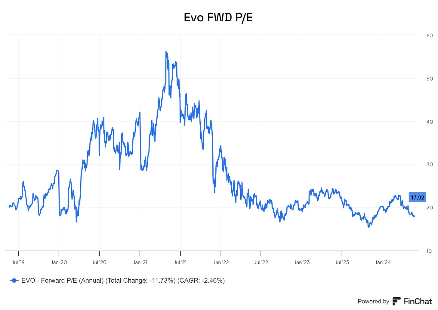 But as I said, the share price has not reflected the fundamental development. Today, the company is trading at a FWD P/E of 17.92, which is right at the bottom of what the company has been priced at over the past five years: