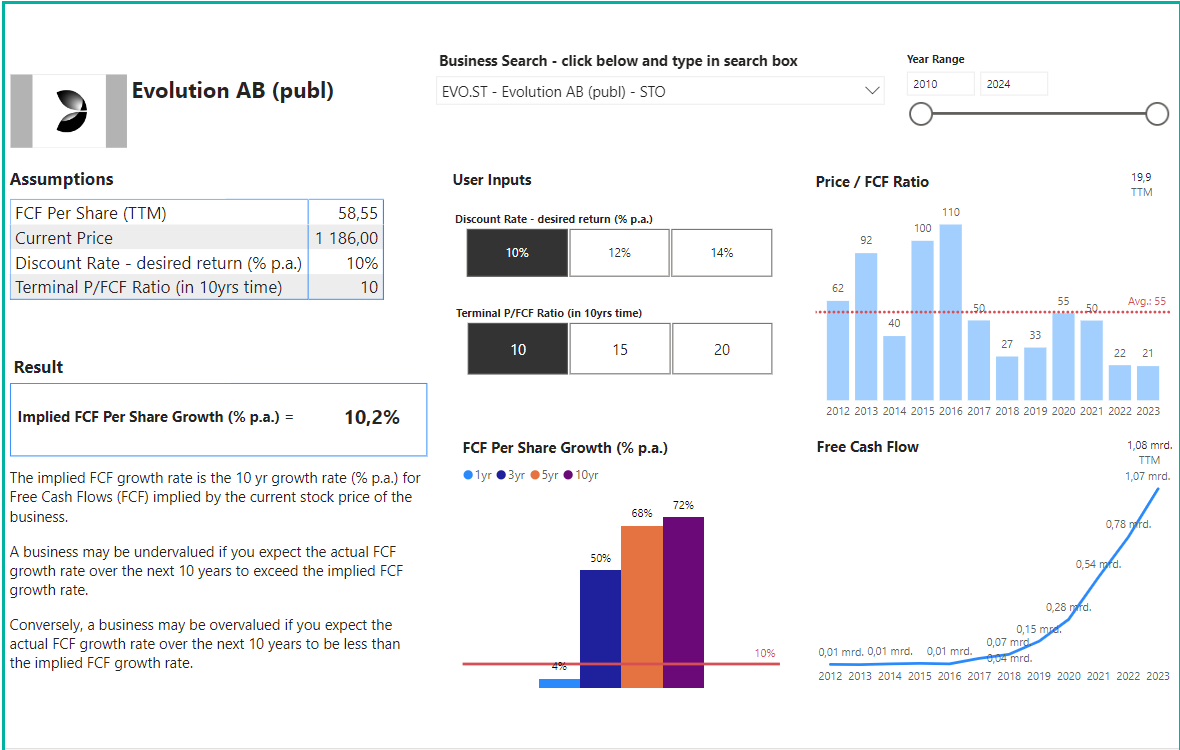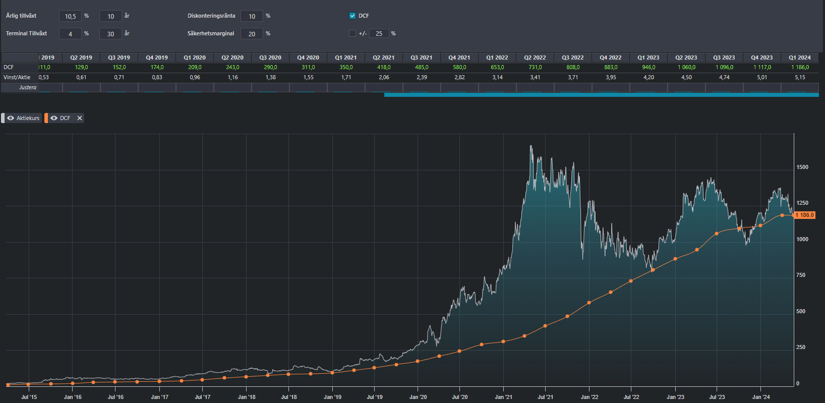 I have carried out three reverse DCF analyses, one by entering figures from the accounts into a template (1), the second is based on Børsdata.se's DCF calculation, which I have entered so that I get as close as possible to the current share price, and the last through stockinvestoriq.com's reverse DCF calculator, which is very useful.