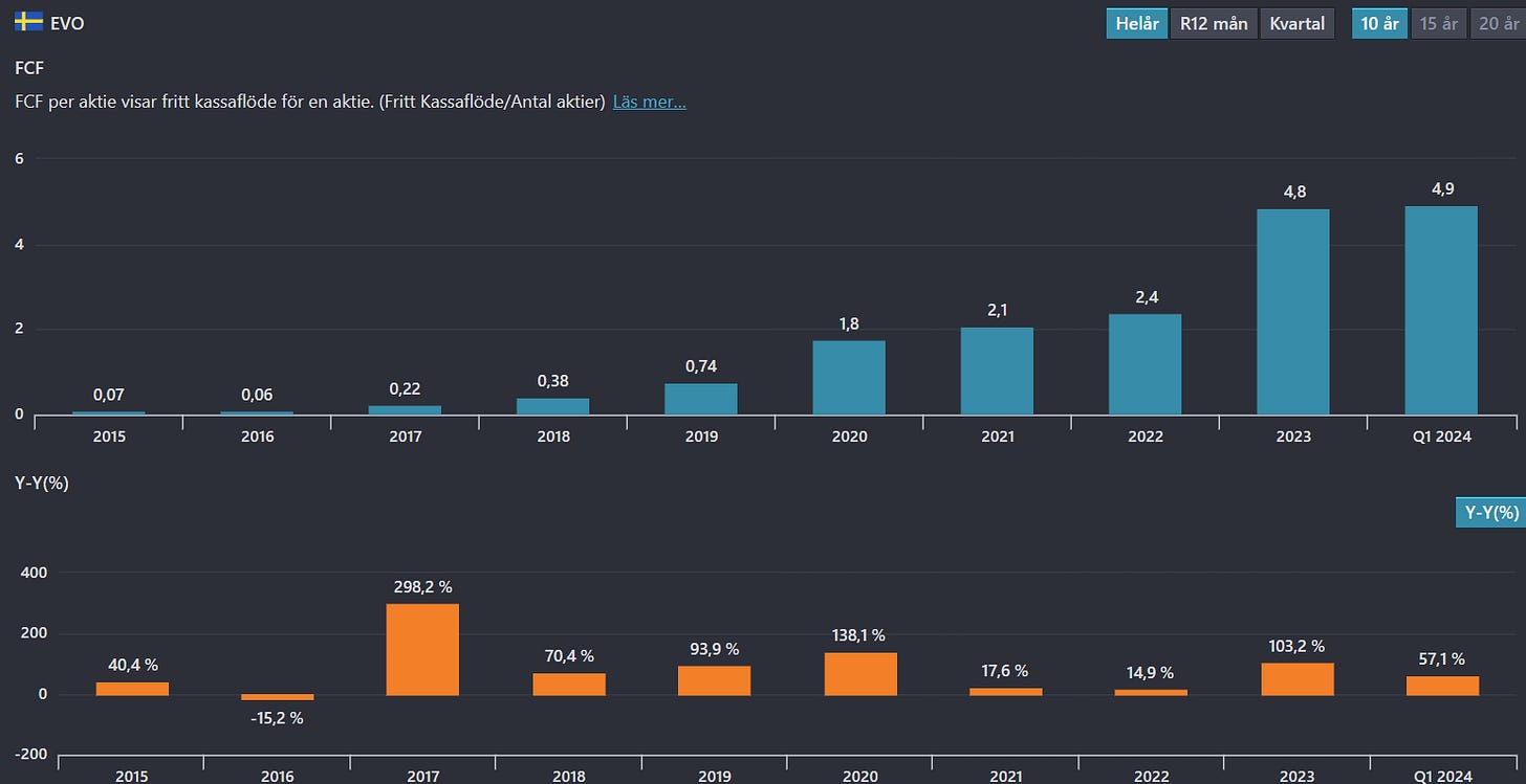 The reverse DCF method is about researching how much growth is priced into a company's share price. As can be seen above from several calculations, the implied growth in today's market capitalisation is around 10-12% FCF growth. Evolution has historically delivered much stronger FCF growth (last 10 years of FCF growth):