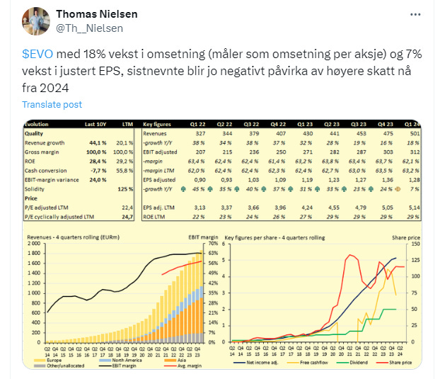 follows the company closely. The author has recently attended both the annual meeting and travelled to Malta to follow Evolution. Here are some of his articles on Evolution's most recent quarters:Thomas Nielsen who manages First Veritas owns shares and follows the company closely, here is his update from Q1 2024: