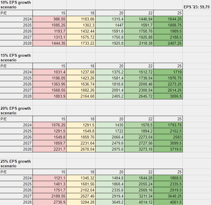 Furthermore, I will present a multiple analysis to show different outcomes of different EPS growth and multiples. As previously discussed, companies that fall outside the ESG categories receive more conservative pricing, so it is not inconceivable that there may be further multiple compression. Here are four different price-to-earnings scenarios:
