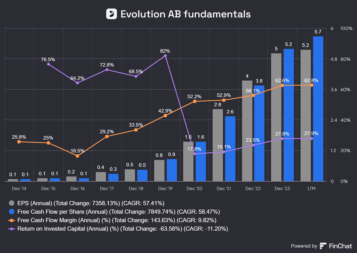 Over the past five years, EPS has seen strong annual growth of 52% a year, FCF has increased by slightly more at 52.13% annually. EVO's FCF margins are at an incredible 61%, and ROIC has stabilised around 27.5%. This is simply put: quality.