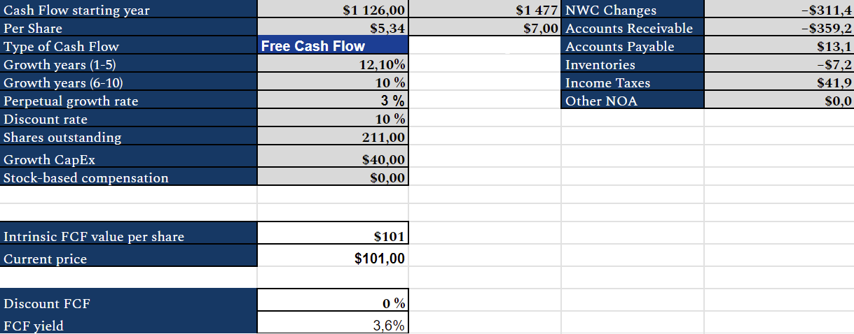 In the following, where I've entered the figures myself, all values are in euros (including the share price). The most important thing to note is Growth years 1-5 and 6-10, which say something about how much expected FCF growth the market is pricing in, intrinsic FCF value per share is a result of this compared to the current price, which is the share price today (21.05.24).